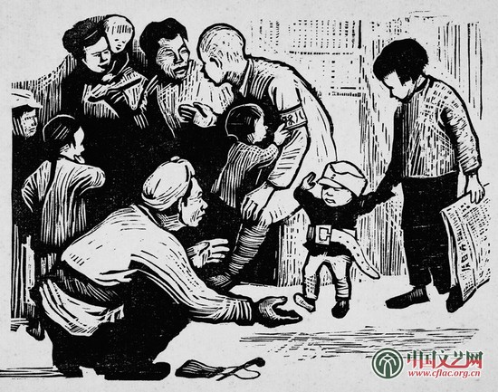 “接地气”以得到更大自由的同时,古元也在同一题材上反复进行艺术探索。1942创作的两幅《哥哥的假期》描绘的是八路军战士休假回到家乡,乡亲们围拢上来好奇地听他讲述部队生活的场景。小孩子对哥哥的制服产生了兴趣,尤其是帽子和腰带,神气地穿在身上,学着哥哥的样子敬礼,感受作为一名八路军战士的自豪。年长的人抽着烟袋锅子仔细地听他讲述时事和见闻。其中,《哥哥的假期(一)》多采用西方木刻技法,在《哥哥的假期(二)》中去掉了许多阴影的面积,人物多用轮廓线表现,这是古元的一次勇敢地艺术探索,逐渐突破西方版画的套路,自觉地将群众喜闻乐见的中国传统绘画形式加入其中。同时,在这一时期,古元的作品还传递了时代的变迁,人们的思想逐渐进步的状态:《哥哥的假期(一)》中画面右侧小姑娘穿着不合身的对襟棉袄、大缅裆裤,虽然手中拿着象征开始学习文化知识的报纸,但仍未跳脱典型旧社会时期的农村女性形象;而《哥哥的假期(二)》中小姑娘穿上了合身的衣裤,人物曲线更加鲜明。这样的改变使画面内容更贴近当时的社会环境,并寄托了古元希望通过自己的版画引导人们改变封建思想的愿望,向群众传达新的审美需求。